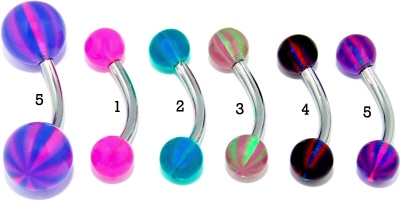Material: Piercing Banana Stecker aus Titan Hochglanzpoliert oder Chirurgenstahl und Multi Color gestreifte Kugeln aus Bio-Synthetik