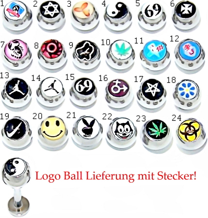 Piercingschmuck Material: Piercing Stecker aus Titan-Hochglanzpoliert oder Chirurgenstahl und Logo Kugel aus Chirurgenstahl