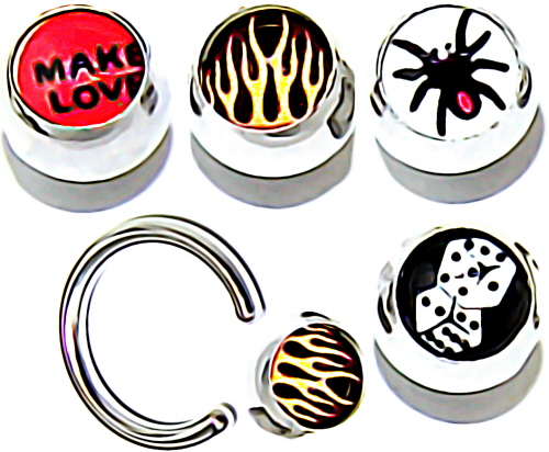Make Love, Flamme, Spinne und Würfel Logo Piercing Klemmkugel