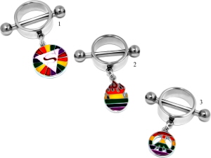 Material: Piercingschmuck Hantel/ Barbell Stecker, Kugeln aus Titan Hochglanzpoliert oder Chirurgenstahl und Rundnippel Schild aus Massiv Chirurgenstahl mit Multi-Color Nippel Schild Anhänger