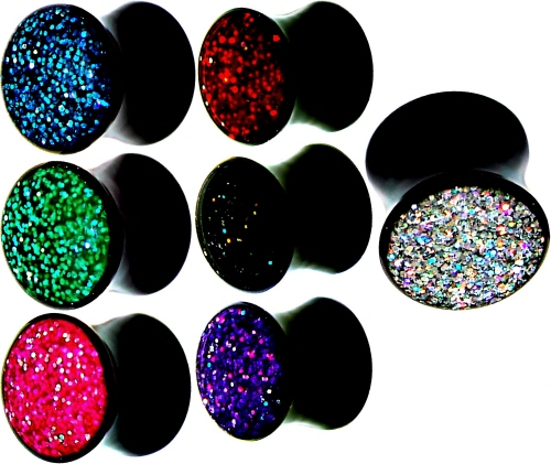 Material: Ohr Piercingschmuck Multi-Color Glitzer Logo Sattel Plugs aus Schwarz Bio-Synthetik