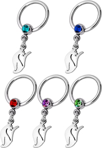 Material: Piercing Ring aus Titan-Hochglanzpoliert oder Chirurgenstahl und Glitzerstein Kugel und Katzen Anhänger aus Chirurgenstahl Hochglanz.