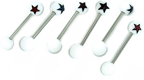 Material: Zungen-Piercing, Nippel-Piercing, Brustwarzenpiercing & Co Gewinde Barbell (Hantel)Stecker aus Titan Hochglanzpoliert oder Chirurgenstahl und UV farbigen Kugeln aus Biosynthetik.