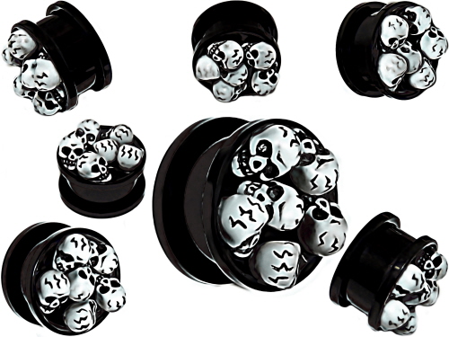 Bio Totenkopf Plug Art: Gewinde Ohr Plug mit 3-D Totenkopf (3, 4, 5 und 6mm Plug besitzen jeweils nur einen 3-D Totenkopf, 8mm zwei 3-D Totenköpfe, 10mm und 12 drei 3-D Totenköpfe, 14mm vier 3-D Totenköpfe, und 16mm sechs 3-D Totenköpfe.