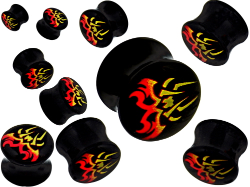 Material: Ohr Piercingschmuck Multi-Color Feuer Tribal Logo Sattel Plugs aus Schwarz Bio-Synthetik.