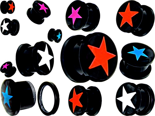 Piercingschmuck Gewinde Flesh-Tunnel Farbe: Schwarz Bio-Synthetik Gewinde Flesh Tunnel mit Rot, Weiß, Blau, Pink Stern Logo.