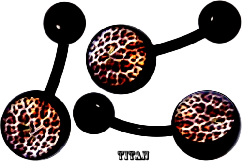 Material: Piercing-Schmuck Banana Stecker und Kugeln aus Schwarz G23 Titan Laser-Plated mit (+) Spezial Titan Beschichtung/ Legierung mit Leoparden-haut Bild Logo.