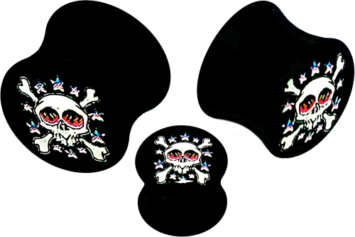 Piercingschmuck Plug Farbe: Schwarzer Bio-Synthetik Kunststoff Plug mit rot weißen Totenkopf Logo