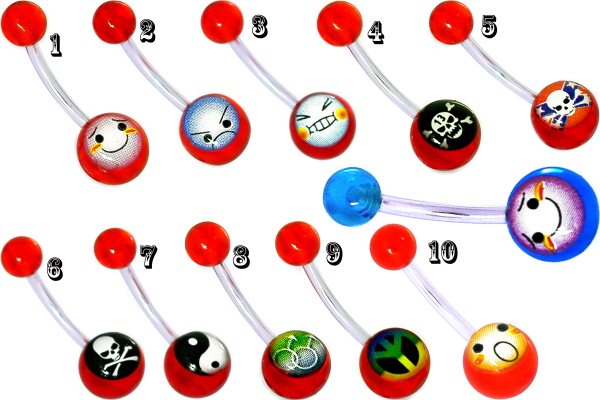 Material: Piercingschmuck Bauchnabel-Piercing, Intim-Piercing, Christina-Piercing & Co Banana Stecker aus Titan Hochglanzpoliert oder Chirurgenstahl und UV farbigen Logo Kugeln aus Biosynthetik.