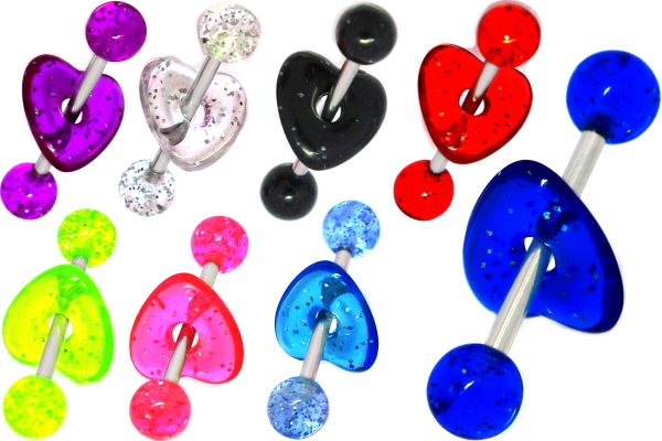 Material: Piercingschmuck Gewinde Barbell (Hantel)Stecker aus Titan Hochglanzpoliert oder Chirurgenstahl und UV farbigen Kugeln und Herz aus Biosynthetik.