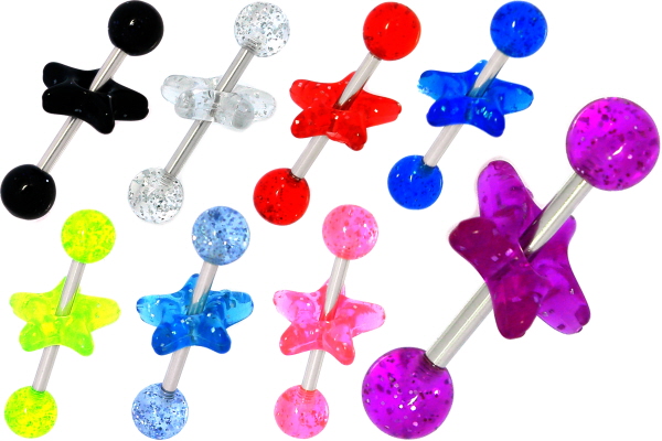 Material: Piercingschmuck Gewinde Barbell (Hantel)Stecker aus Titan Hochglanzpoliert oder Chirurgenstahl und UV farbigen Kugeln und Stern aus Biosynthetik.