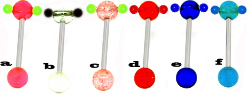 Material: Piercingschmuck Gewinde Barbell (Hantel)Stecker aus Titan Hochglanzpoliert oder Chirurgenstahl und UV farbigen Kugeln aus Biosynthetik.