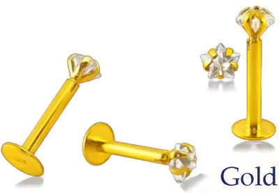 Echt Gelbgold Lippe, Labret, Ohr, Tragus & Co Piercing Flat-Back Stecker mit Glitzerstein-Kugel Aufsatz.