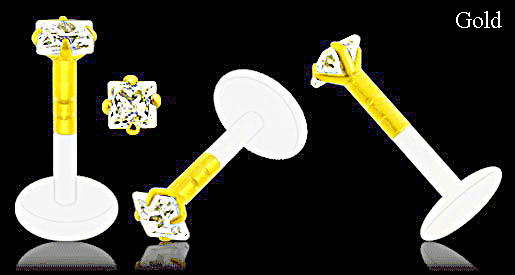 Material: Piercingschmuck Flat-Back Stecker aus Bioplastik und Glitzerstein-Kugel/ Aufsatz Stecker aus 14kt / 585er echt Gold.