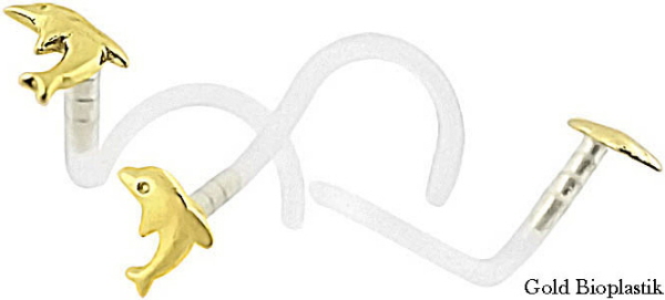 Material: Nasenpiercing Delfin Stecker aus 14kt/ 585er echt Gelb-Gold und gebogener Stecker aus Bio-Plastik.