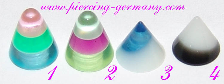 Material: UV Bioplastik Gewinde: 1,6mm Kegel (B x H): 4 x 4mm nur Kegel 3 und 4 Kegel (B x H): 5 x 5mm nur Kegel 1 und 2 Sofort lieferbar! Piercing-Schmuck leuchten im UV-Licht!
