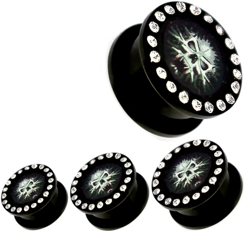Bioplastik Ohrpiercing & Co Schwarz Gewinde Flesh-Tunnel mit Totenkopf Logo und Multi-Schliff Kristallen.