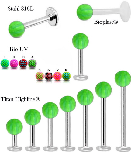 Material: Piercing Flat-Back Stecker aus Titan Hochglanzpoliert, Chirurgenstahl oder Bioplast® und Kugel aus UV Bio-Synthetik.