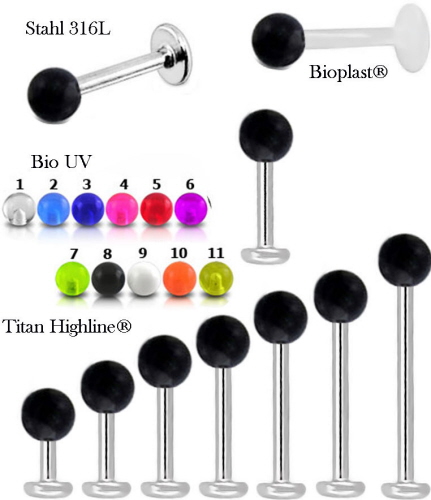 Material: Piercing Flat-Back Stecker aus Titan Hochglanzpoliert, Chirurgenstahl oder Bioplast®  und Kugel aus UV Bio-Synthetik.