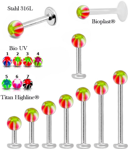 Material: Piercing Flat-Back Stecker aus Titan Hochglanzpoliert, Chirurgenstahl oder Bioplast® und Kugel aus UV Bio-Synthetik.
