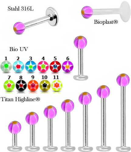 Material: Piercing Flat-Back Stecker aus Titan Hochglanzpoliert, Chirurgenstahl oder Bioplast® und Kugel aus UV Bio-Synthetik.