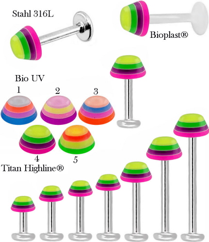 Material: Piercing Flat-Back Stecker aus Titan Hochglanzpoliert, Chirurgenstahl oder Bioplast® und Multi Color Kegel aus UV Bio-Synthetik.