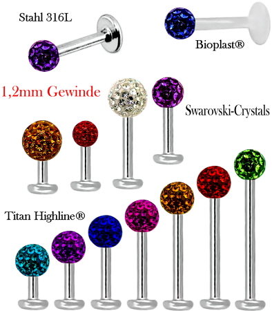 Material: Piercing Flat-Back Stecker aus Titan Hochglanzpolier, Chirurgenstahl oder Bioplast® mit Multi-Schliff Swarovski Kristall Gewinde Kugel.