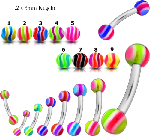 Material: Piercing Schmuck Banana Stecker aus Titan Hochglanzpoliert oder Chirurgenstahl und Bio UV Multi-Color farbigen Gewinde Kugeln aus Biosynthetik.