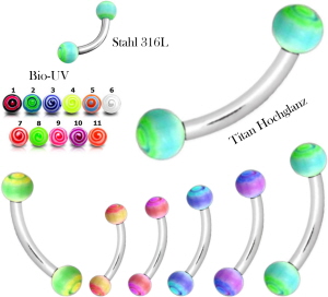 Material: Piercing Schmuck Banana Stecker aus Titan Hochglanzpoliert oder Chirurgenstahl und Bio UV Multi-Color farbigen Gewinde Kugeln aus Biosynthetik.