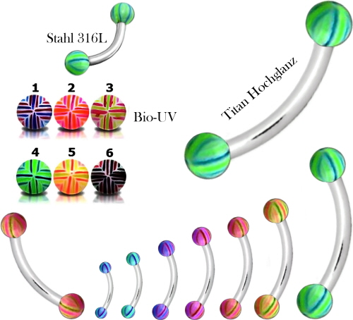 Material: Stecker aus Titan Hochglanzpoliert oder Chirurgenstahl und Bio UV Multi-Color farbigen Gewinde Kugeln aus Biosynthetik.