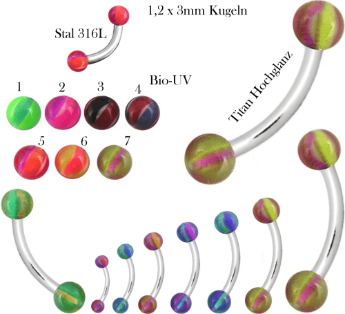 Material: Piercing Schmuck Banana Stecker aus Titan Hochglanzpoliert oder Chirurgenstahl und Bio UV Multi-Color farbigen Gewinde Kugeln aus Biosynthetik.