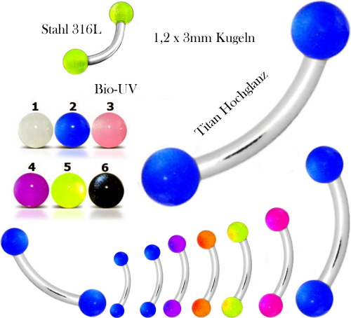 Material: Piercing Schmuck Banana Stecker aus Titan Hochglanzpoliert oder Chirurgenstahl und Bio UV Multi-Color farbigen Gewinde Kugeln aus Biosynthetik.