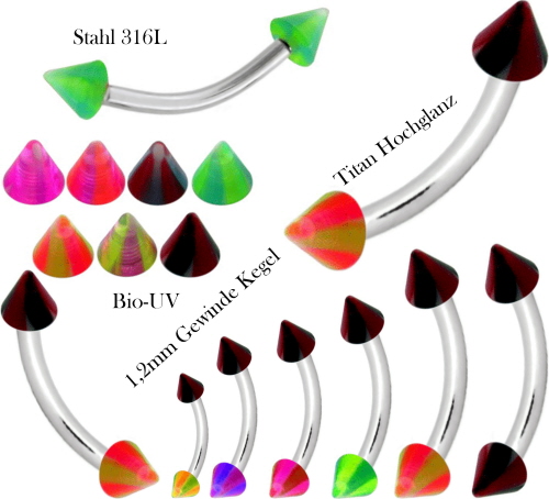 Material: Piercing Schmuck Banana Stecker aus Titan Hochglanzpoliert oder Chirurgenstahl und Bio UV Multi-Color farbigen Gewinde Kegel aus Biokunststoff.