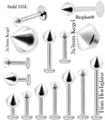 Material: Piercing Flat-Back Stecker aus Titan Hochglanzpoliert, Chirurgenstahl oder Bioplast® und Gewinde Kegel aus Chirurgenstahl.