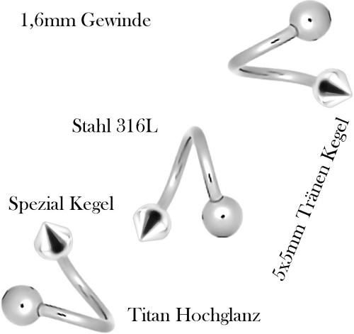 Material: Piercingschmuck Spiralen Ring und Gewinde Kugel aus Titan Hochglanzpoliert oder Chirurgenstahl und Gewinde Kegel aus Chirurgenstahl.