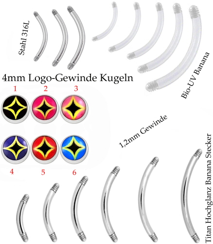 Material: Piercing Banana Stecker aus Titan Hochglanzpoliert, Bio UV oder Chirurgenstahl und Logo Gewinde Kugeln aus Chirurgenstahl.