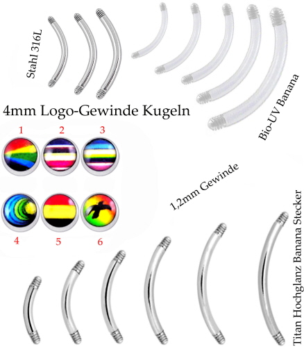 Material: Piercing Banana Stecker aus Titan Hochglanzpoliert, Bio UV oder Chirurgenstahl und Logo Gewinde Kugeln aus Chirurgenstahl.