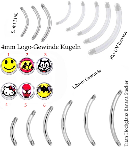 Material: Piercing Banana Stecker aus Titan Hochglanzpoliert, Bio UV oder Chirurgenstahl und Logo Gewinde Kugeln aus Chirurgenstahl.