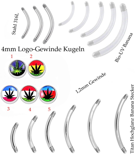 Material: Piercing Banana Stecker aus Titan Hochglanzpoliert, Bio UV oder Chirurgenstahl und Logo Gewinde Kugeln aus Chirurgenstahl.