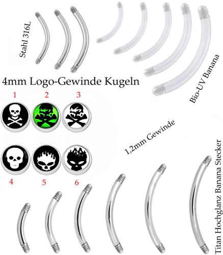 Material: Piercing Banana Stecker aus Titan Hochglanzpoliert, Bio UV oder Chirurgenstahl und Logo Gewinde Kugeln aus Chirurgenstahl.