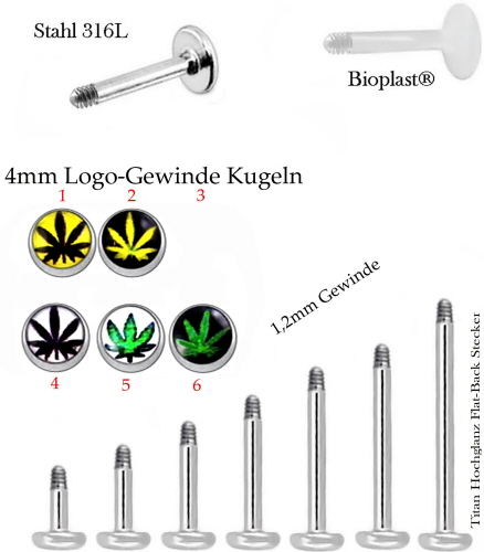 Material: Piercing Flat-Back Stecker aus Titan Hochglanzpoliert, Chirurgenstahl oder Bioplast® und Multi-Color Blatt Logo Gewinde Kugeln aus Chirurgenstahl.