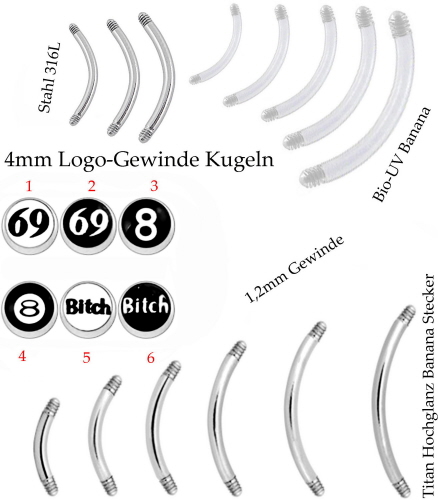 Material: Piercing Banana Stecker aus Titan Hochglanzpoliert, Bio UV oder Chirurgenstahl und 69, Zahl-8 & Co Logo Gewinde Kugeln aus Chirurgenstahl.