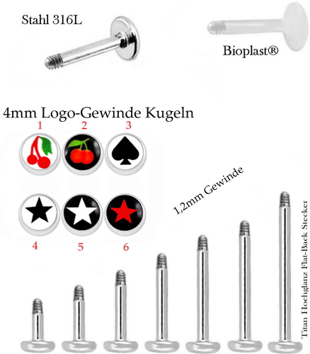 Material: Piercing Flat-Back Stecker aus Titan Hochglanzpoliert, Chirurgenstahl oder Bioplast® und Kirsche, Pik Ass und Stern Logo Gewinde Kugeln aus Chirurgenstahl.
