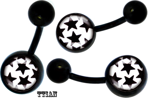 Material: Piercing-Schmuck Banana Stecker und Kugeln aus Schwarz G23 Titan Laser-Plated mit (+) Spezial Titan Beschichtung/ Legierung mit Schwarzen Stern Bild Logo.