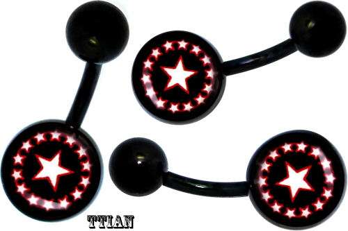 Material: Piercing-Schmuck Banana Stecker und Kugeln aus Schwarz G23 Titan Laser-Plated mit (+) Spezial Titan Beschichtung/ Legierung mit Rot Weißen Sternen Bild Logo.