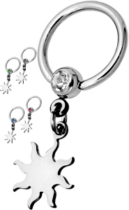 Material: Piercing Ring aus Titan-Hochglanzpoliert oder Chirurgenstahl und Glitzerstein Kugel und Sonnen Anhänger aus Chirurgenstahl Hochglanz.