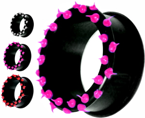 Schwarzer Silikon-Tunnel mit weißen Noppen in 22mm, schwarzer Silikon-Tunnel mit roten Noppen in 10mm und 26mm.